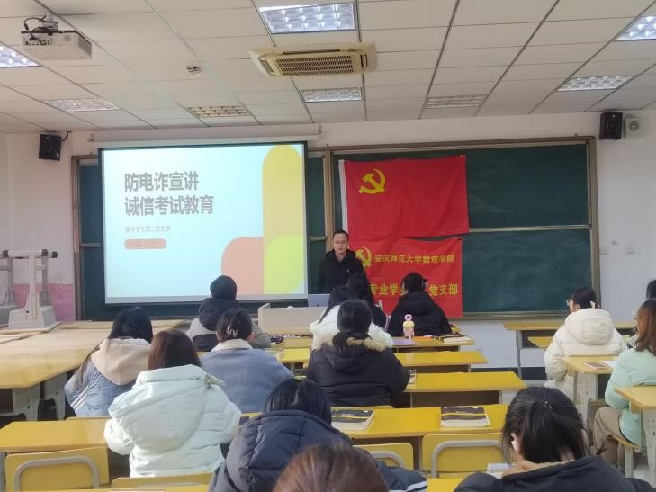 2024年12月25日,数学专业学生第二党支部在I602召开“防电诈宣讲及诚信考试教育”主题党日活动,支部全体学生党员和入党积极分子参加,会议由支部书记江凡老师主持。
