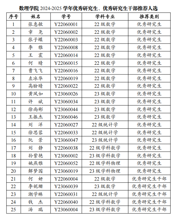 根据《安庆师范大学研究生表彰奖励办法》和学校《关于做好2024-2025学年优秀研究生、优秀研究生干部评选工作的通知》精神和要求,经研究生个人申请、班级和辅导员初核、学院学位评定委员会评议、学院党委会和党政联席会议审定,拟推荐张惠敏等20名研究生、何妍等5名研究生分别为校级优秀研究生和优秀研究生干部人选,推荐人选公示如下: